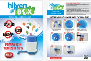 Türkiye de İlk ve tek olan Hijyen Box Su Sebillerinin ve Damacana Su Pompalarının Temizlik ve Dezenfektesi için kullanılması gereken ihtiyaç olan tüm malzemeleri içerir bir set tir.